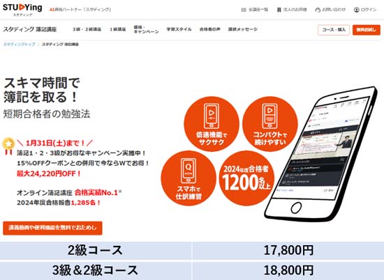 この革新的なeラーニングシステムにより、スマホだけの効率学習で短期合格が狙えるため、机に向かう勉強時間が確保できない方には、超おすすめのオンライン簿記講座です!