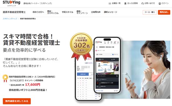 この革新的なeラーニングシステムにより、スマホだけの効率学習で短期合格が狙えるため、机に向かう勉強時間が確保できない方には、スタディング賃貸不動産経営管理士講座を一番におすすめします!