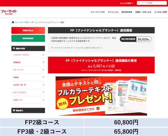 | 講座名/受講料 | <2級受験資格がある方はこちら> ①FP2級合格カリキュラム:(フル)76,780円 (ライト)49,280円 <3級から受験する方はまずこちら> ②FP3級総合講義:無料 |