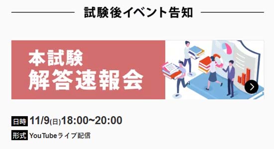 | 動画配信 | 11月9日(日) 19:30~ 解答速報会 11月15日(土) 10:00~11:15 本試験分析会 ※要申込み |