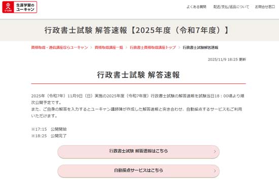 ユーキャンでは、行政書士試験当日の18:00頃から順次、解答速報を公開する予定です。(17:15に解答速報が開始されました)
